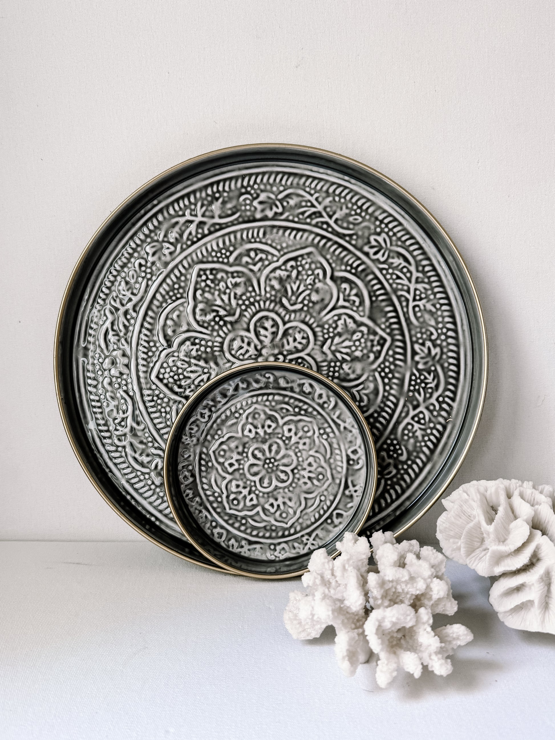 Our hand embossed enamel trays are crafted by skilled artisans in India. Use them to serve drinks, display candles or flowers.